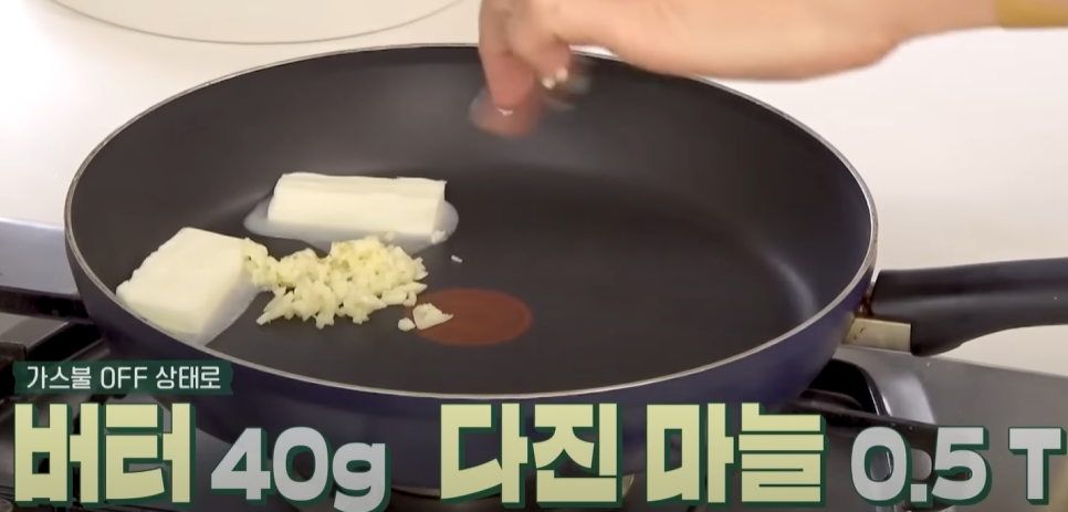 1️⃣ 팬에 버터와 다진 마늘 넣고 중약불로 볶기