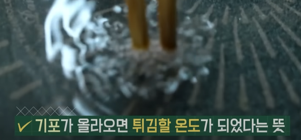 4. 180도 기름에서 중불로 4분간 튀깁니다. 보글보글 소리 나면 OK!